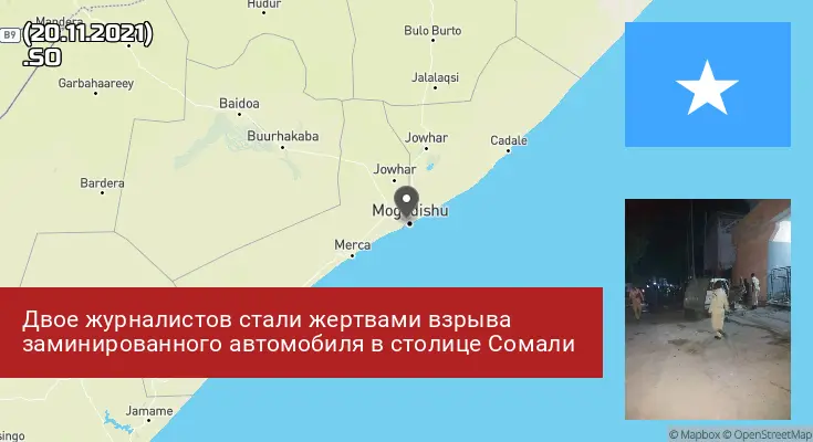 Заминированный автомобиль, в котором находились двое журналистов, взорвался в субботу вечером на улице в Могадишо, столице Сомали.